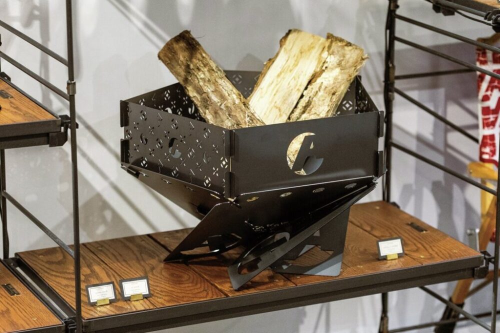 アシモクラフツを代表するプロダクトのひとつである焚き火台であるタキビノアシの黒皮鉄板仕様とオリジナル風防のセット。オリジナルのモノグラム柄が幻想的な光を演出する。なかなかセットで手に入れにくい人気作なので、実物を目にする機会は貴重でもある。