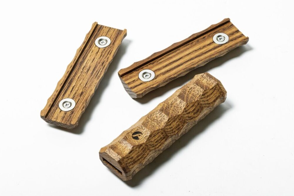 アシモクラフツの人気モデルであるアシグリップ。これはタークの鉄フライパンの持ち手に取り付けるカスタムパーツ。ヴィンテージ加工のオークを使った。8800円