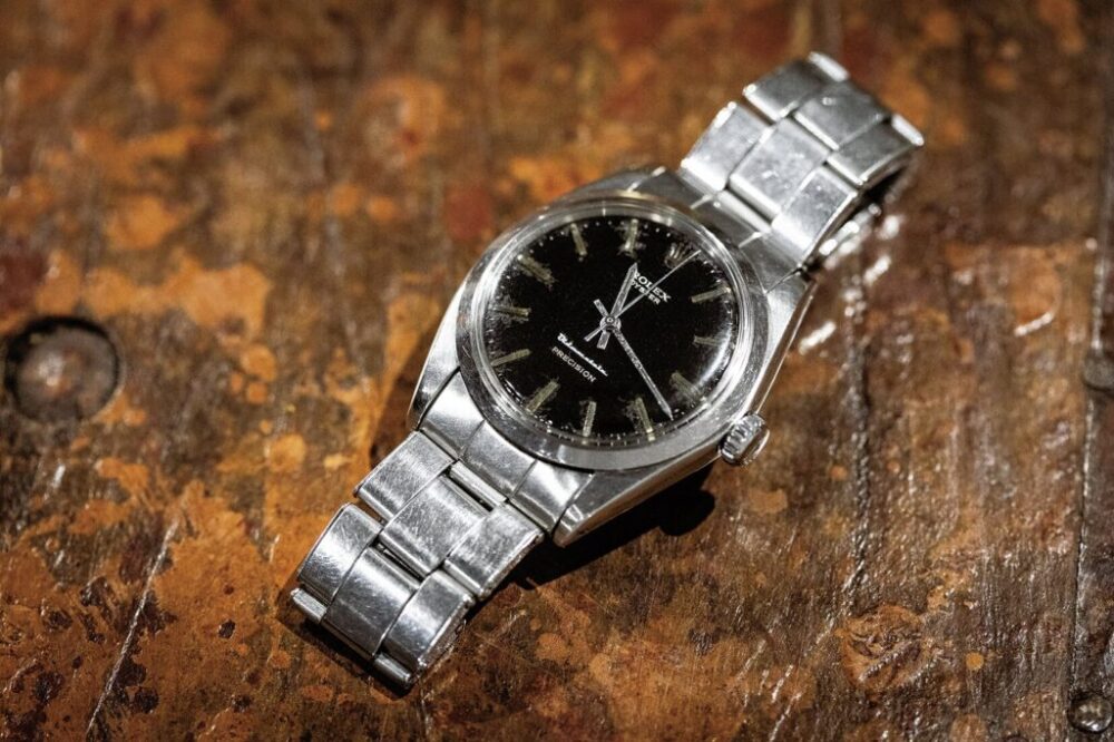今回のオープンのスペシャルアイテムの代表格が、アンティークのロレックス。なんと文字盤にはオールドマウンテンのロゴがカスタムされている。計3つの時計が用意されているが、その中でももっともレアなのが、ミラーダイアルの当モデルである。107万8000円