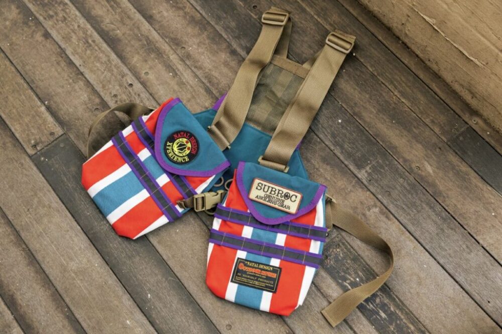 ハイセンスなフィッシングギアを展開するサブロックとゴーフィッシュの3社コラボレーションしたヘビーデューティなフローティングベスト。本来の機能性を損なうことなく、ネイタルデザインのオリジナルファブリックであるレトロストライプ/カモを落とし込んでいる。