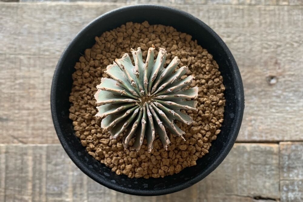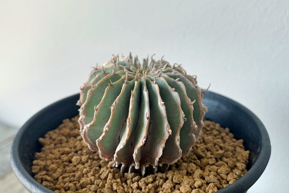 ゲオヒントニア・メキシカーナの魅力は、僅かに棘が生えた細く深いアコーディオンの様な稜と青磁色の肌ではないでしょうか。