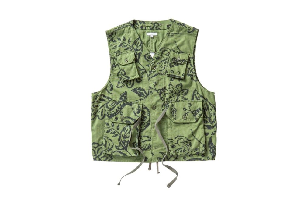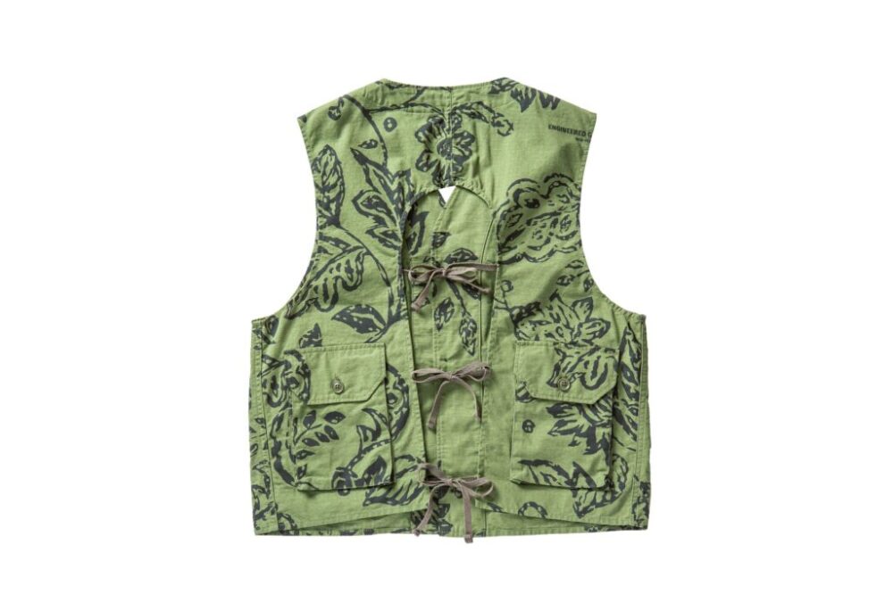 空軍のミリタリーベストをベースに製作。シンメトリックに配置された収納力の高いポケットと身幅を調節できる3本のストリングが配された背面のデザイン、ポップなフローラルプリントも特徴的。4万2900円(エンジニアド ガーメンツ TEL03-6419-1798)