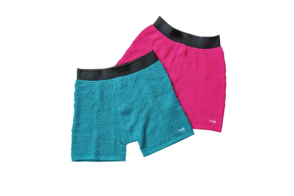 なめらかな肌触りと防臭性、調温性のあるメリのウールと、ブリングマテリアルの再生ポリエステルの混紡で乾きやすい。前後リバーシブルだから前後と裏表で4日穿ける? ウールの配合率で2タイプあり。ピンク/ 3740円 ブルー/4180円(ブリング エビス TEL03-4400-1251)
