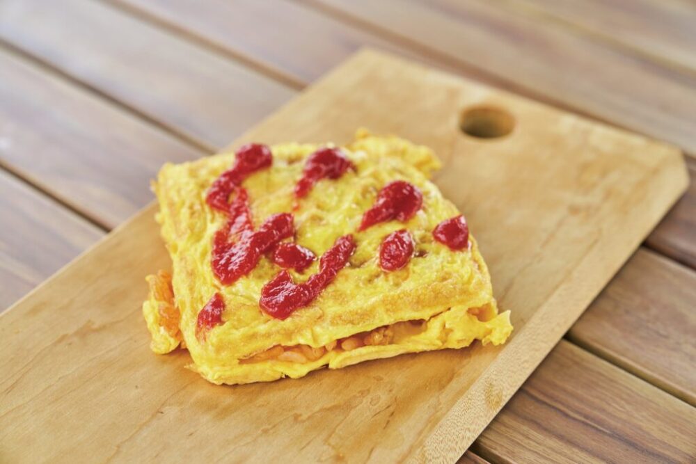 焼けた卵をチキンライスにのせ、ホットサンドメーカーを繋げて圧迫。両面同じ焼き加減にするのがポイントだ。ケチャップをかけて完成。