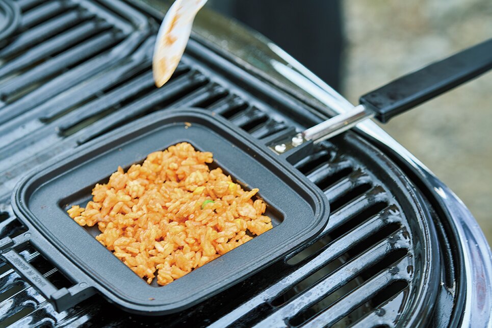 セパレートにしたホットサンドメーカーにチキンライスをのせて温める。ときどき混ぜながら、熱がまんべんなくいきわたるようにしよう。