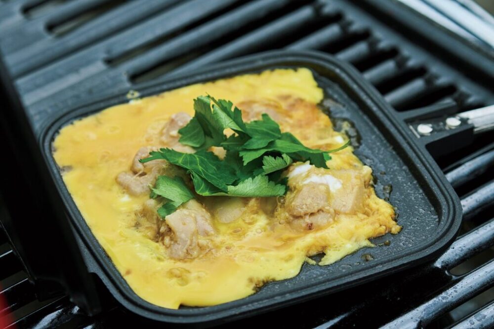 鶏肉にソースが染みこんだら、溶き卵を回しかけてとじる。10 ~ 20秒ほど蓋をして、卵が固まったら完成。ご飯にのせていただこう。