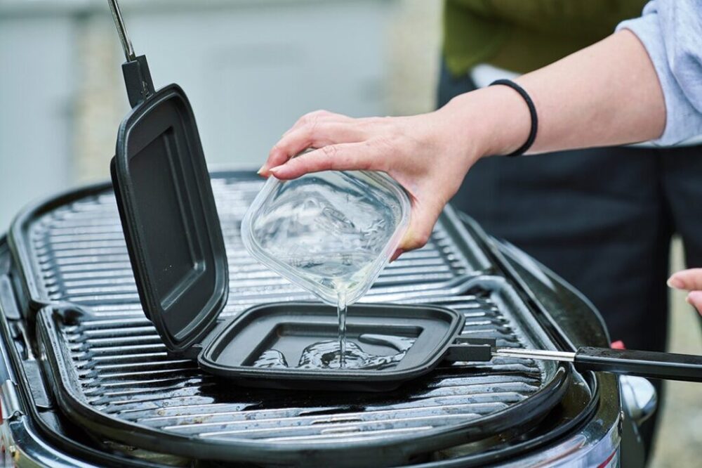 まずはだし汁を入れる。前日に作って持っていってもいいし、顆粒タイプを使って現場で作ってもいい。この一手間で確実に味が変わるぞ。