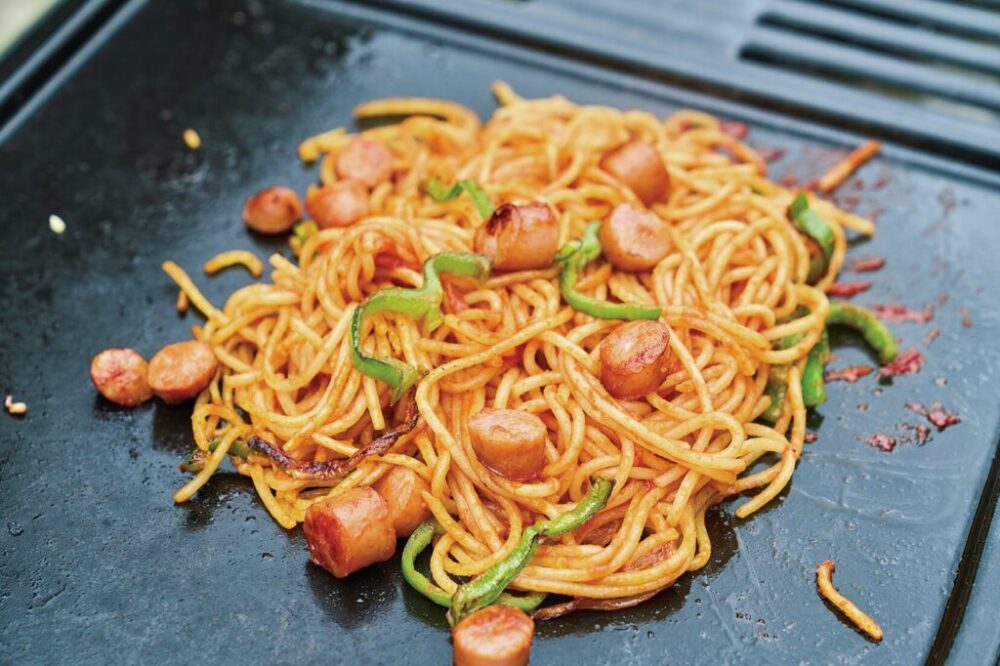 ほぐしたパスタとケチャップを投入。パスタはその場で茹でてもいいし、冷凍パスタを使ってもOK。よく混ぜて焼いたら出来上がり!