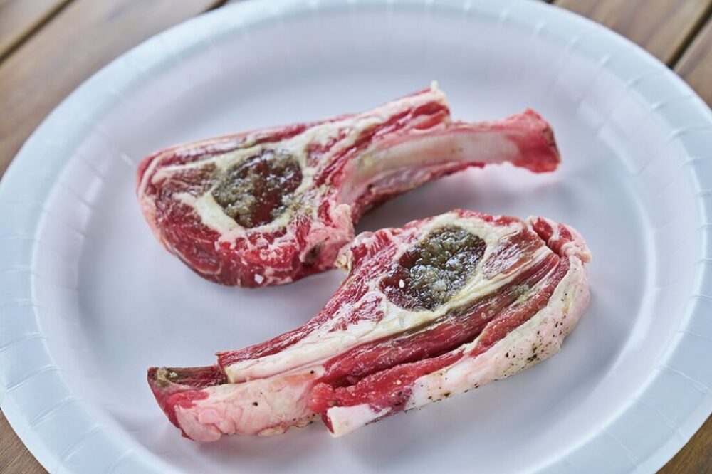 骨付きラムに塩コショウ、おろしニンニクを塗りつけて冷蔵庫でマリネする。これを前日の夜にやっておけば、現地では焼くだけ!