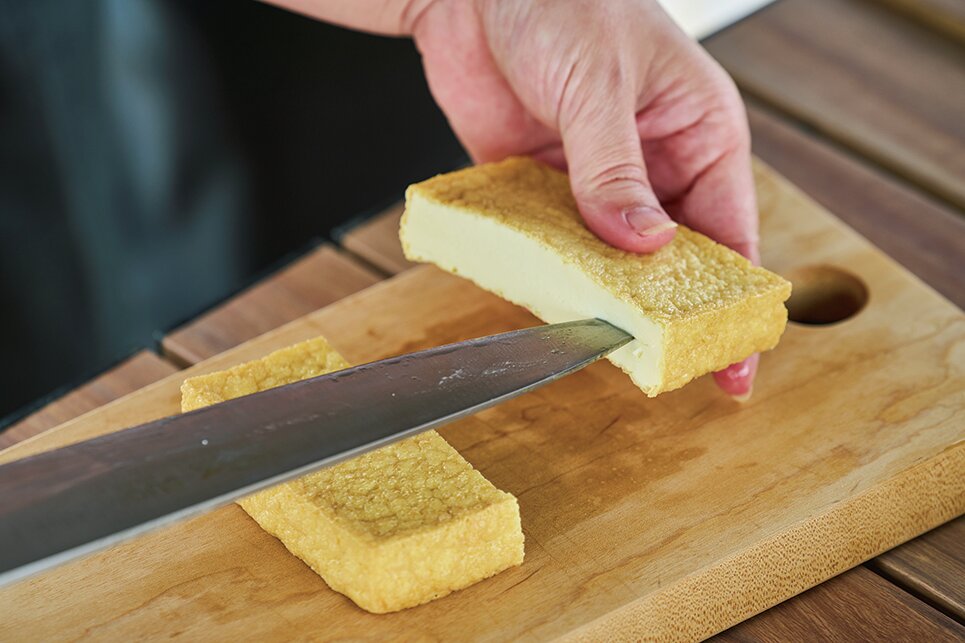 まず厚揚げを半分にカットして、それぞれの中央に写真のように切り込みを入れる。具材がたっぷり入るよう深めに入れよう。