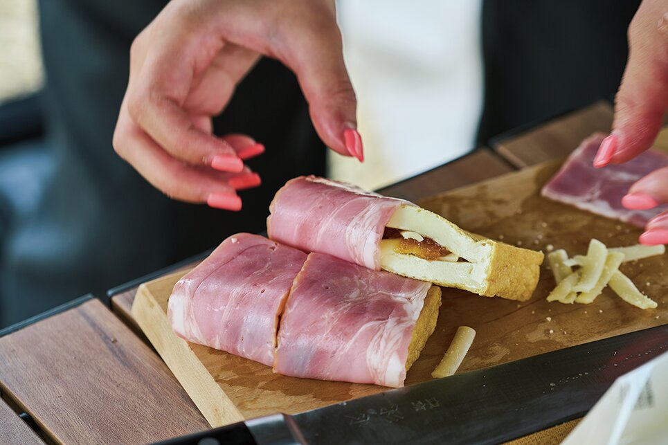 お酒のアテにはこちらの料理。厚揚げの中にチーズを入れてベーコンで巻いて焼く。ポイントはステーキソース。焼くことでとろけたチーズとステーキソースが混ざり合い、素敵なマリアージュが実現。