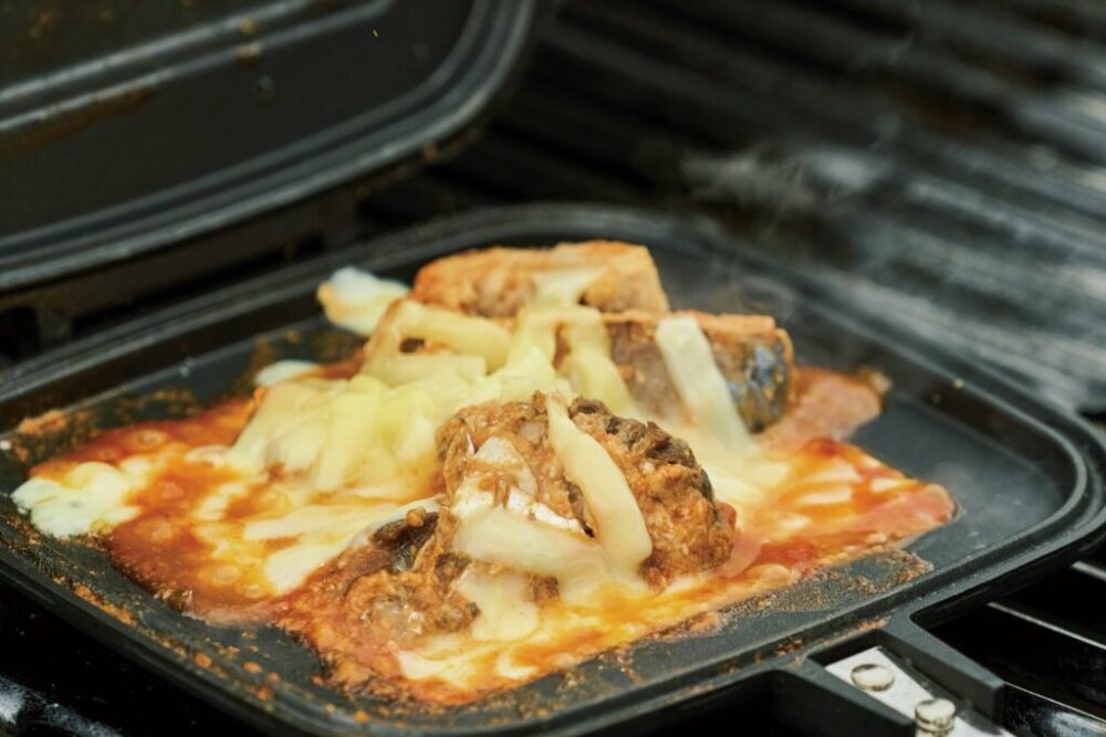 ホットサンドメーカーに具材を入れたら蓋をして煮込む。サバの中央まで熱が通ったら、チーズをかける。このチーズがいい仕事をするんです。