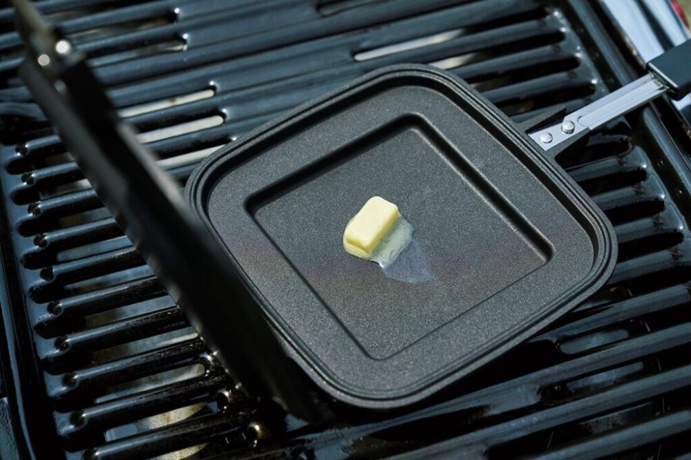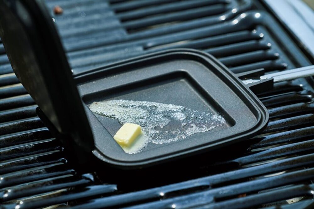 まずはホットサンドにバターを溶かす。バター好きはたっぷりと、脂を控えたい人は少量でも十分にバターの風味が出るのでお好みで。