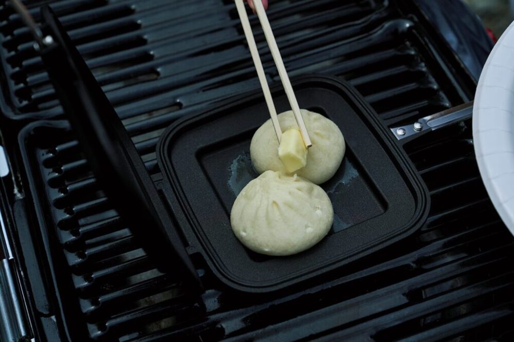 肉まんもアウトドアの定番になりつつある食材のひとつ。温めるだけでもいいけれど、せっかくならアレンジを楽しんでみない? 今回はバターで焼いてみた。表面はカリッ、中はジュワ~、そしてバター風味がたまりません。