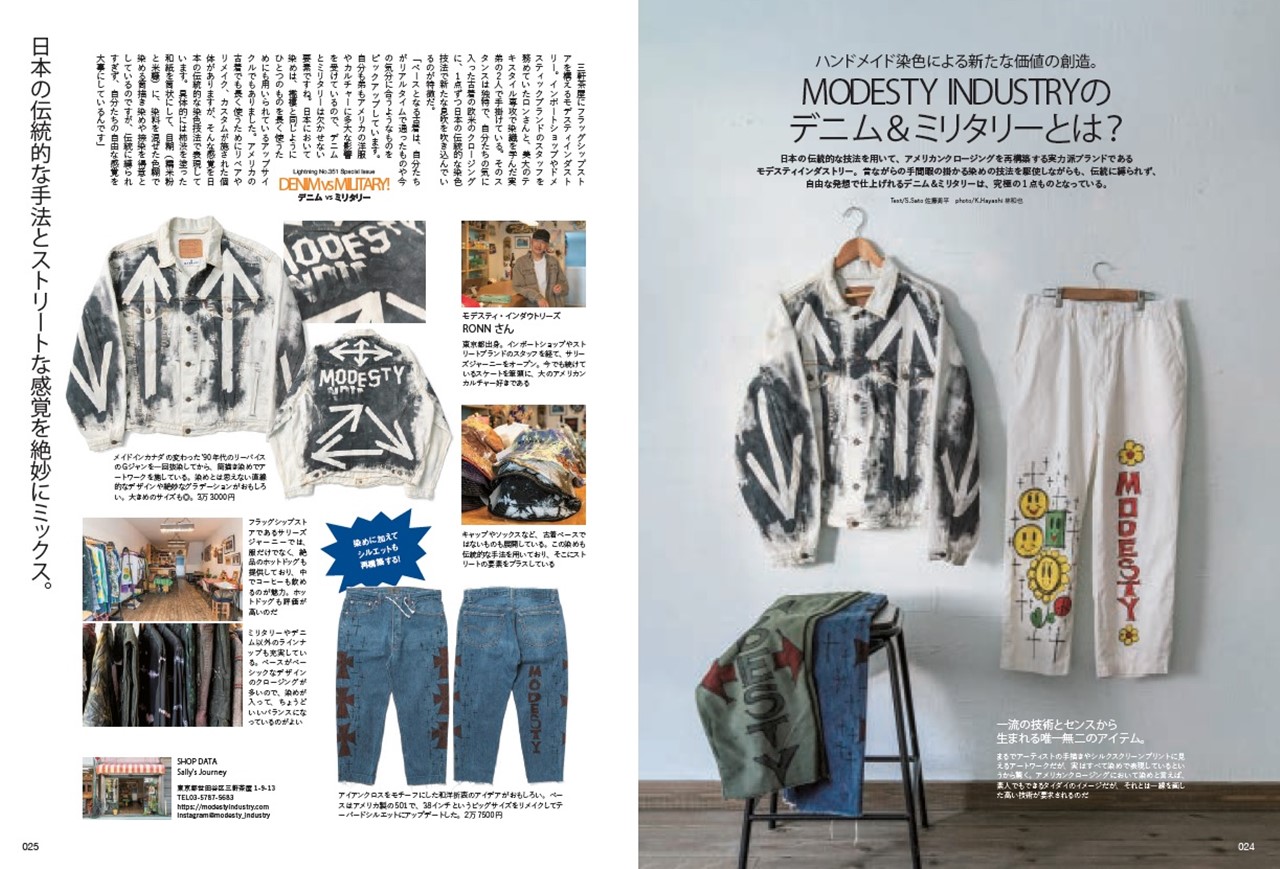 今月の特集「デニム vs ミリタリー」では、両者に関わる技術や注目店舗なども取材。モデスティインダストリーは、日本の伝統的な技法を用いて、アメリカンクロージングを再構築する実力派ブランド。昔ながらの手間暇の掛かる染めの技法を駆使しながらも、伝統に縛られず、自由な発想で仕上げれるデニム&ミリタリーは、究極の1点ものと言っても過言ではありません。