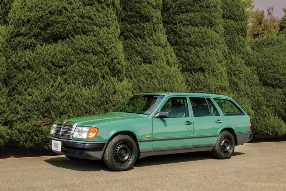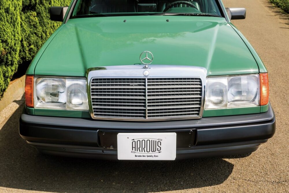 日差しに映えるグリーンのステーションワゴン。こちらは1993年式の320TEで、アローズのクラシックラインにカスタムされたものだ。