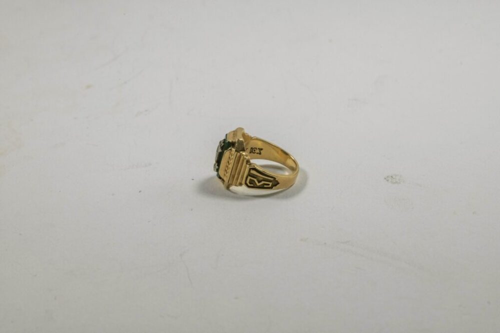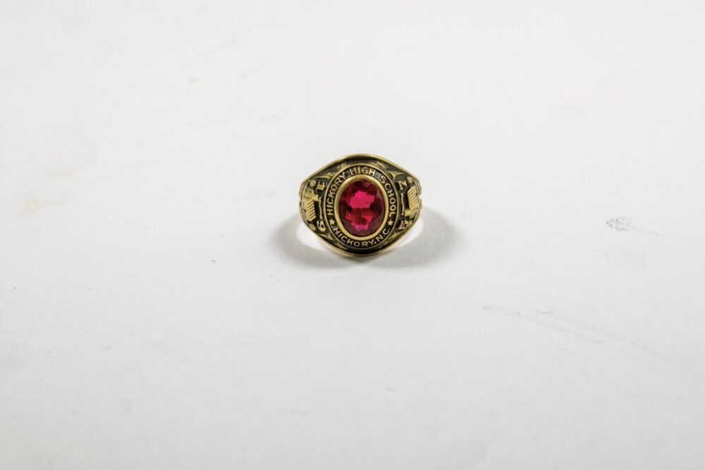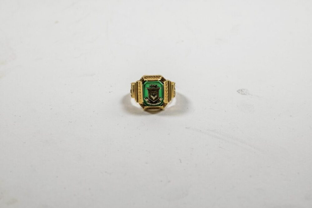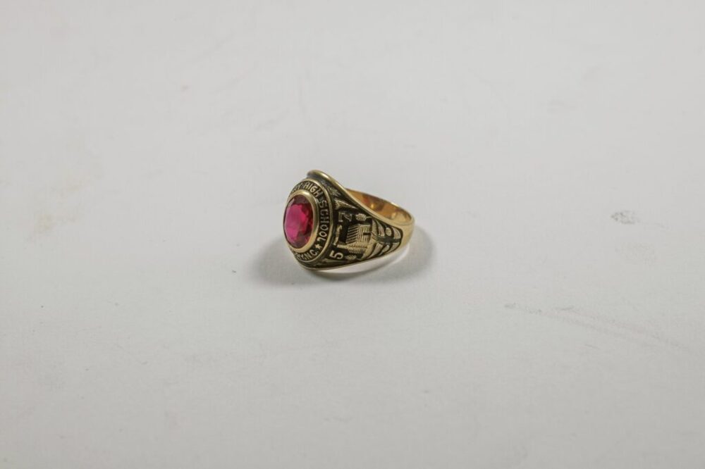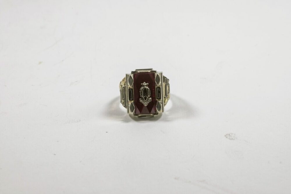 1957 年 HICKORY HIGH SCHOOLの10金モデル。’50年代としては珍しく大ぶりな合成ルビーをあしらい、重厚感ある彫刻も目を引く。6万5000円