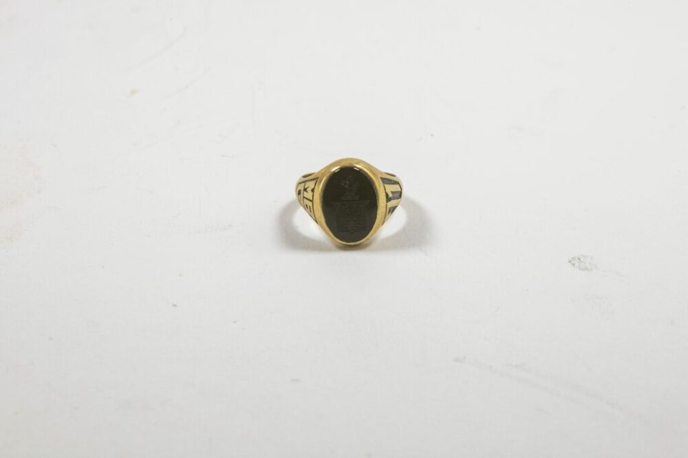 カレッジリングというと中央に配された石を思い浮かべる人も多いと思うが、これは主に’60年代に入ってから。’50年代以前はシグネットリングの影響が色濃く残るのか、学校のロゴなどが刻印されていることが多い。また石の形も「オーバル型」や「スクエア型」、表面の加工によって「スムース」「ファセット」「サンバースト」、さらには石の周りの「ベゼル」部分の装飾や仕様など様々なタイプが見られる。
