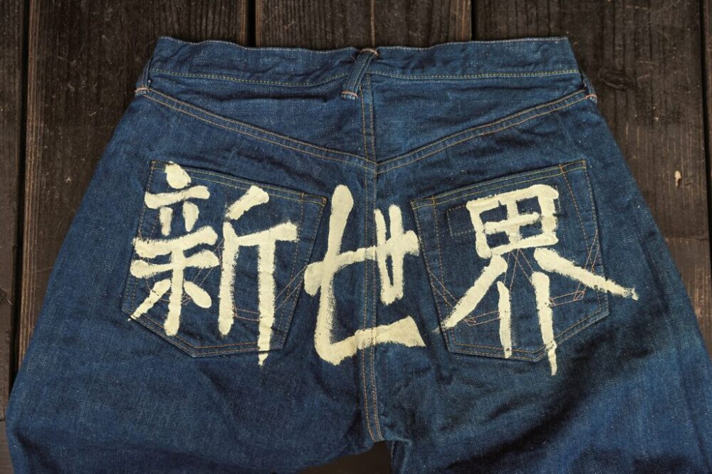 定番ジーンズのバックスタイルに大きく「新世界」とペンキで描かれたショップを代表する1本。もちろんハンドペイントされている。