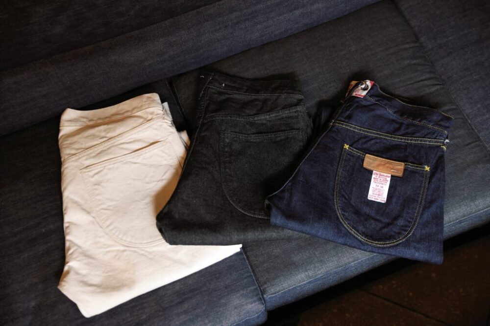 定番白黒デニムとカシミヤ混のデニム。左、中央2万4200円、右1万9800円〜3万3000円
