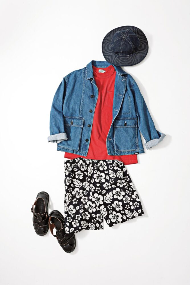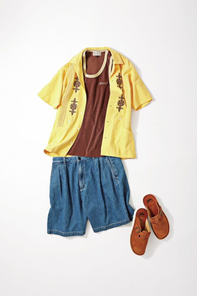 ストリートテイストが強いデニムショーツは、夏のボトムスに最適なアイテム。素材が持つラフな印象に合わせて、開襟シャツ&タンクトップでラフに合わせると雰囲気よく着まわせるはずだ。
