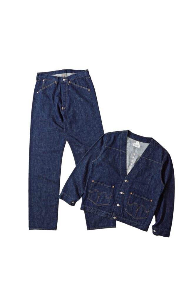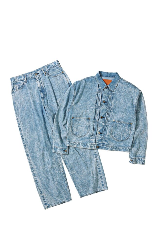旧きよき時代のデニムジャケットのような、フロントプリーツの意匠が特徴となった10オンスのケミカルデニムを使用したセットアップ。ジャケット4万8400円、パンツ4万700円(ソラリス TEL0467-91-0058)