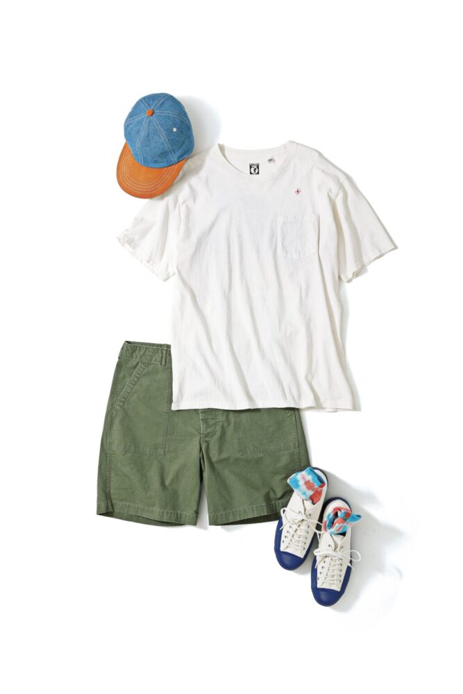 穢れなき印象の白Tシャツにシンプルなベイカーショーツの組み合わせは、真夏の少年スタイル(笑)。だからアクティブなイメージを持つパネルキャップとスニーカーでYOUNG感も演出したい。