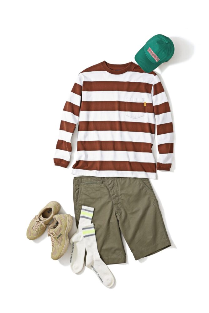 外遊びのスタイリングに迷ったら、上下の色調をアースカラーで統一することで、シンプルな装いにスタイルをまとめることができる。特にボーダーのロンTeeはカジュアルスタイルと好相性だ。