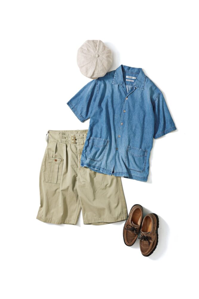 ミリタリーテイストのスタイリングに相性抜群のデニムアイテム。そこでライトオンスの開襟デニムシャツをグルカショーツと合わせてみると思いのほか好印象。ワークブーツでタフさもプラス。