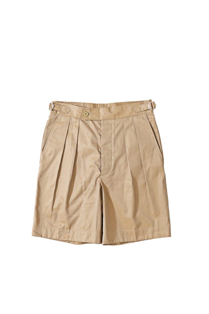 ’80年代のイギリス軍のショーツをデザインソースに作成されたグルカショーツ。高密度に織り上げたツイル生地はツヤ感のあるドライタッチで、夏場にも最適なライトウエイトな素材感だ。2万900円(ブリックレイヤー TEL03-5734-1098)
