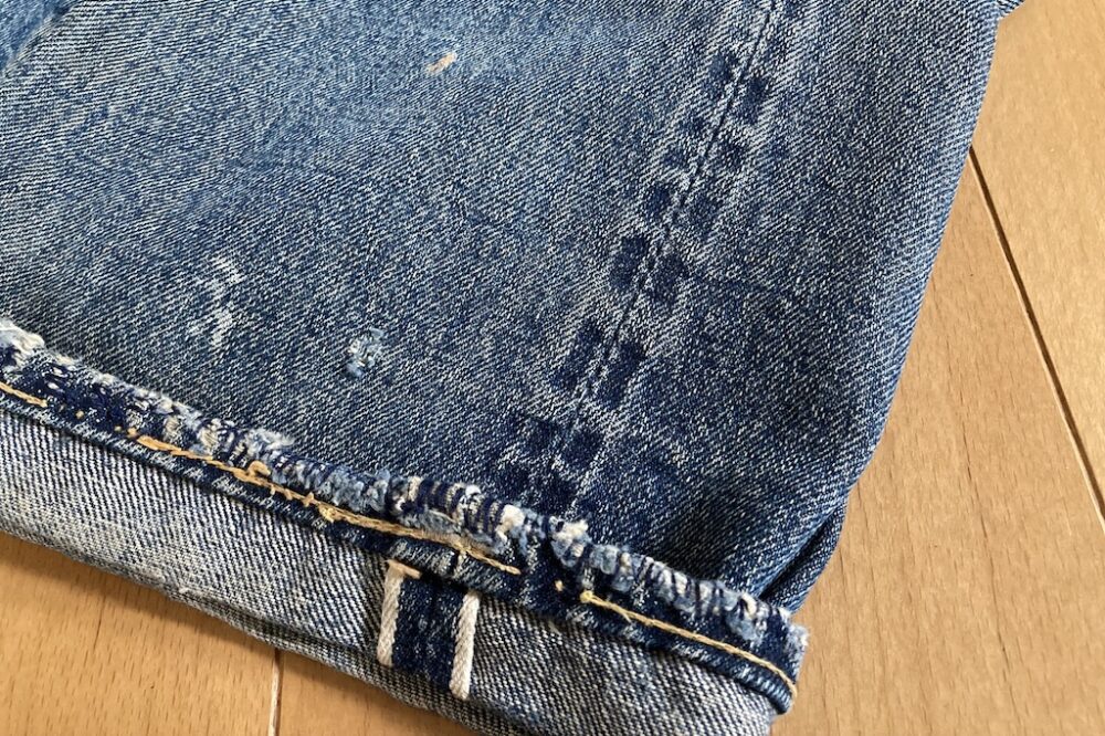 ヴィンテージ(リーバイスであれば1980年代以前)やヴィンテージスタイルのデニムは、旧式の力織機を使って織られたセルビッジ(生地のミミ)付きの生地を使っていることがほとんど。パンツの場合、セルビッジ部分を外側のサイドシームに使っているので、最初はフラットだった生地が、着用と洗濯を繰り返すと裏側にあるセルビッジの凹凸部分がアタリとなって、表面に独特な経年変化を生み出してくれる。これをサイドのアタリと表現する。これがキレイに出てくるとヴィンテージデニムさながらの表情に見えてくる。セルビッジの無い生地の場合はサイドシームの端がロックミシンで縫われているだけなので、セルビッジデニムほどアタリが激しく出なかったりする。