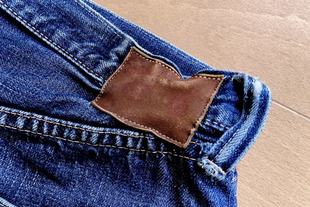 ヴィンテージデニムにも見られるレザーパッチが縮んで乾燥した状態。レザーの素材や乾燥機に入れるなど、特定の条件がそろったときに起きる現象で、雰囲気はヴィンテージっぽくなるけれど、腰周りの生地が波打ってしまうので穿きやすさは損なわれてしまう場合もある。ヴィンテージジーンズではビーフジャーキー状になったパッチは外されることが多かった。そんな性質があったため、後年のジーンズは素材が安定している紙パッチになったという説もある。経年変化のひとつではあるが、すべてのレザーパッチがこうなるわけではないし、色落ちとは関係ないので番外編として紹介。