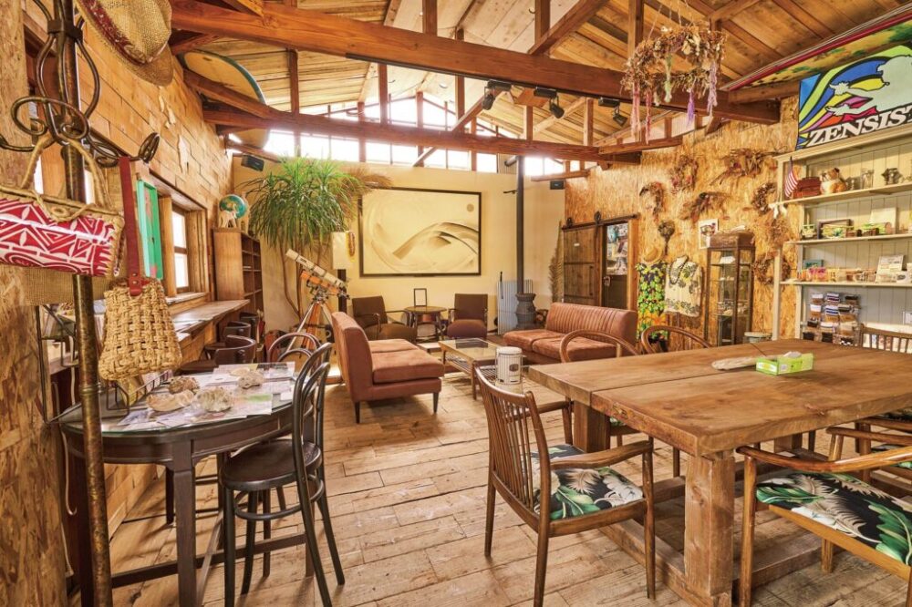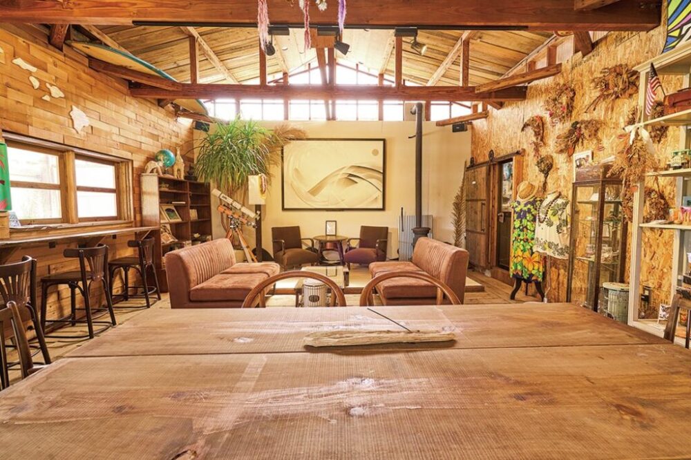 オアフ島のノースショアにありそうなウッディな平屋のカフェ。そのくせ勝浦でも海というより山の方にあるのが、おもしろい。いや、もっとおもしろいのはココがキャンプ場でもあることだ。さらにカフェの内外装もキャンプサイトも、そこにある遊具含めてすべて齋藤さんがほとんどひとりでDIYで作りあげたものだ。