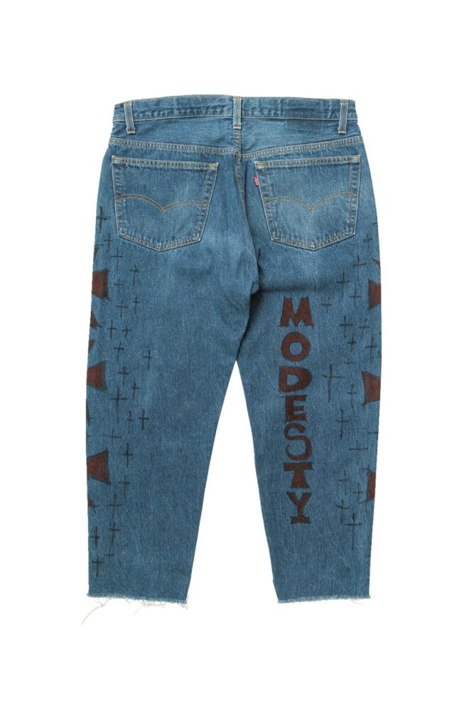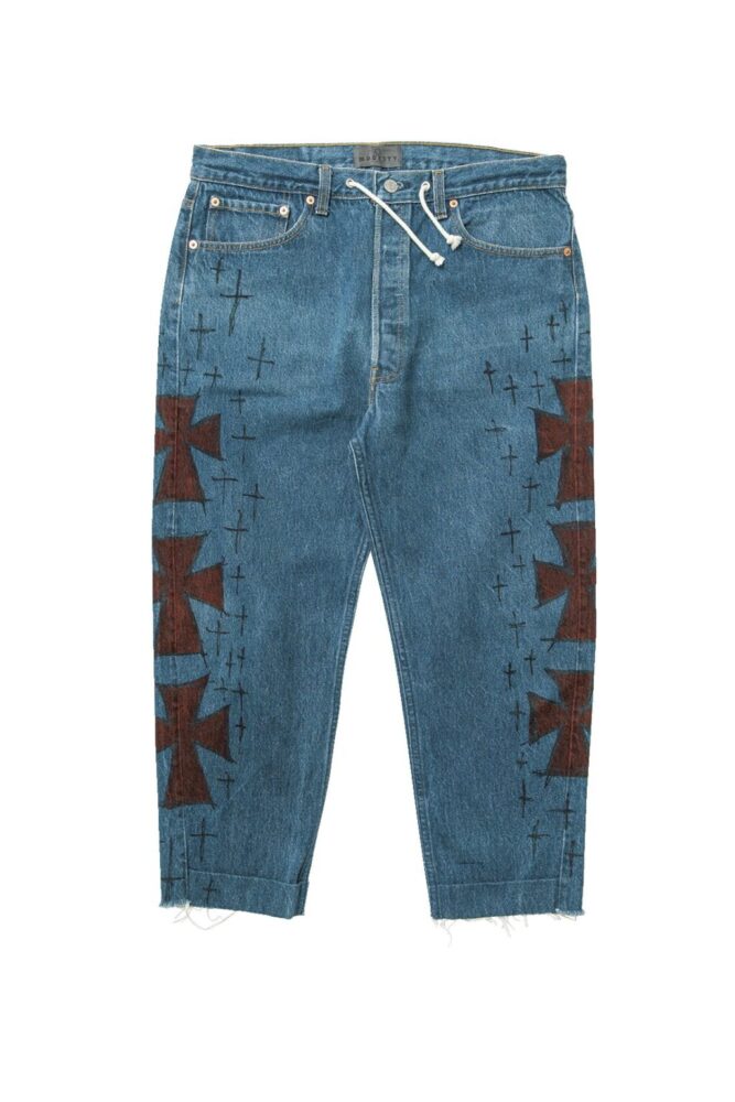アイアンクロスをモチーフにした和洋折衷のアイデアがおもしろい。ベースはアメリカ製の501で、38インチというビッグサイズをリメイクしてテーパードシルエットにアップデートした。2万7500円