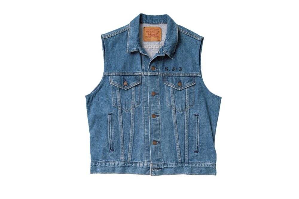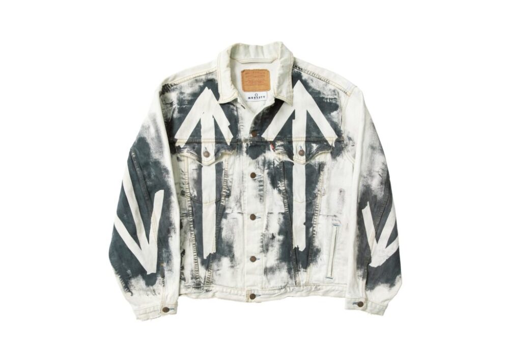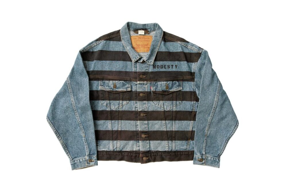 デカタグの付いたリーバイスのGジャンに、プリズナーのようなボーダーを染めで施した。大きめなサイズも◎。3万800円