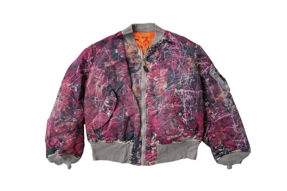 パンチの効いた芸術的なMA-1は、アルファがベース。あえてグレーのベースにこだわり、色糊でナイロンを染めた。3万8500円