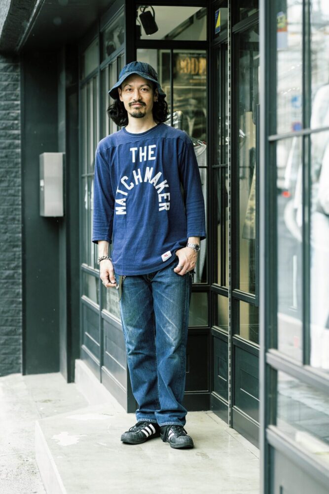 名店ベルベルジンの店長を務める野原さんは、ブルーのワントーンコーデで、ミリタリーとデニムをうまく調和している。王道のリーバイスのヴィンテージデニムに合わせて、USアーミーのデニムハットをチョイス。足元はカジュアルにスーパースターでまとめた。