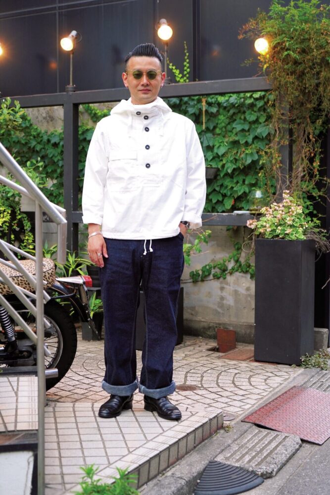 アトラクションズの代表を務める西崎さんは、ウエアマスターズのサルベージスモックパーカに、定番の5ポケットデニムでコーディネイト。ホワイト×インディゴブルーの春夏らしい爽やかなカラーリングが絶妙。USネイビーの名作がデザインソースになっている。