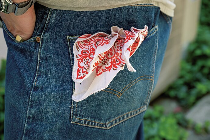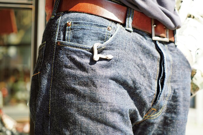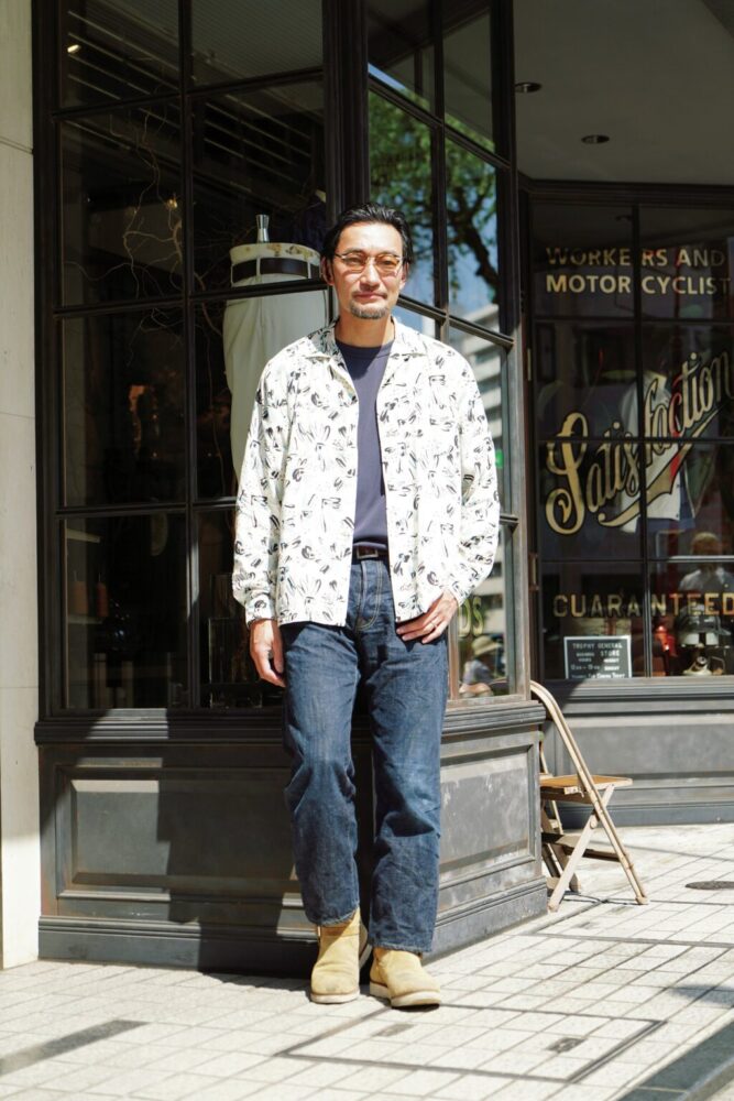 東京のバイクシーンを牽引するひとりでもある江川さんは、ハワイアンシャツ×5ポケットデニムという王道スタイルでも、しっかりと差別化。あえて長袖をチョイスし、インナーのTシャツ使いや足元のエンジニアブーツなどでうまくリラックス感を調和させているのがお見事。