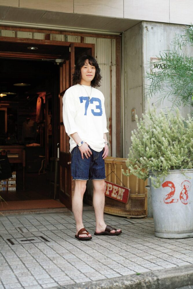 ウエアハウス東京店のスタッフである岡本さんは、20代らしくフレッシュなショーツコーデを披露。ともにウエアハウスで、トップスのフットボールTは、少し大き目のサイズ感で着ることで、よりスポーティな印象に。逆に足元はバランスを取って、レザーサンダルにしている。