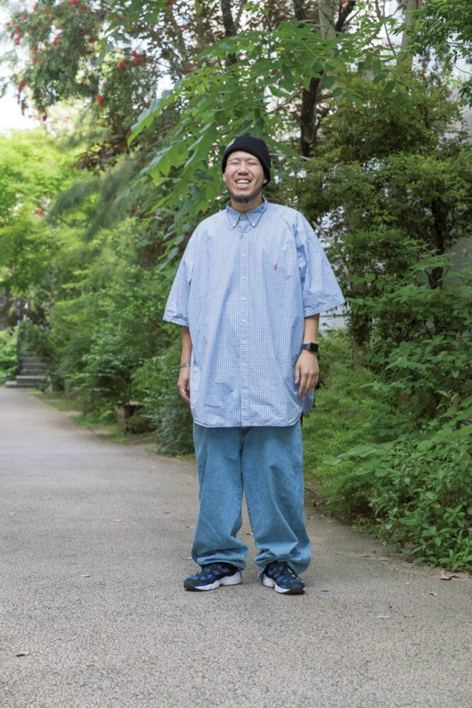 20代のスニーカーフリークとして知られた存在である大島さんは、大の’90sスニーカー好きということもあり、懐かしいゲスのバギーデニムに、ポロラルフローレンのBDシャツをセレクト。彼の矜持を感じられる腰パンに、アシックスのマニアックなGel maiを合わせている。