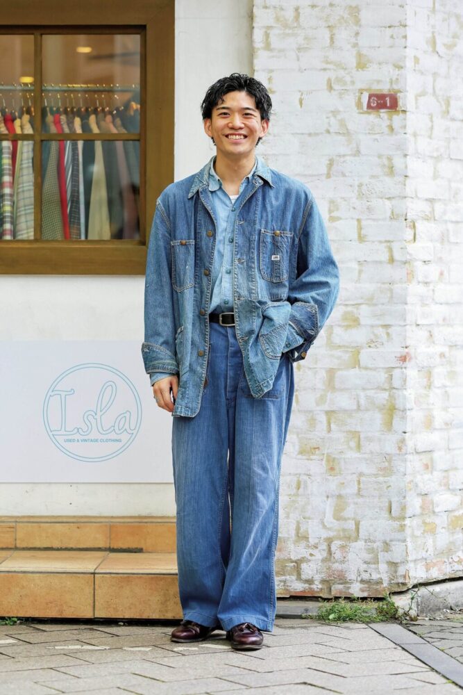 美しいエイジングを見せるリーのヴィンテージカバーオールにインナーはシャンブレーと極太デニムパンツでワントーンに仕上げた。「カラーの統一だけでなく、シャツ、パンツともにU.S.ネイビーのセットを着用しました。インディゴとはいえ、異なる色の雰囲気が好きです」