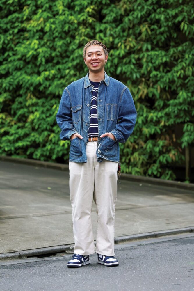 ブランドは不明だが、ボタンや生地、ステッチなどのディテールから1940年代のデニムカバーオールを主役にコーディネイト。「白いペンキ跡とデニムのコントラストをホワイトパンツとスニーカーでもリンクさせることで統一感のあるコーディネイトをイメージしました」
