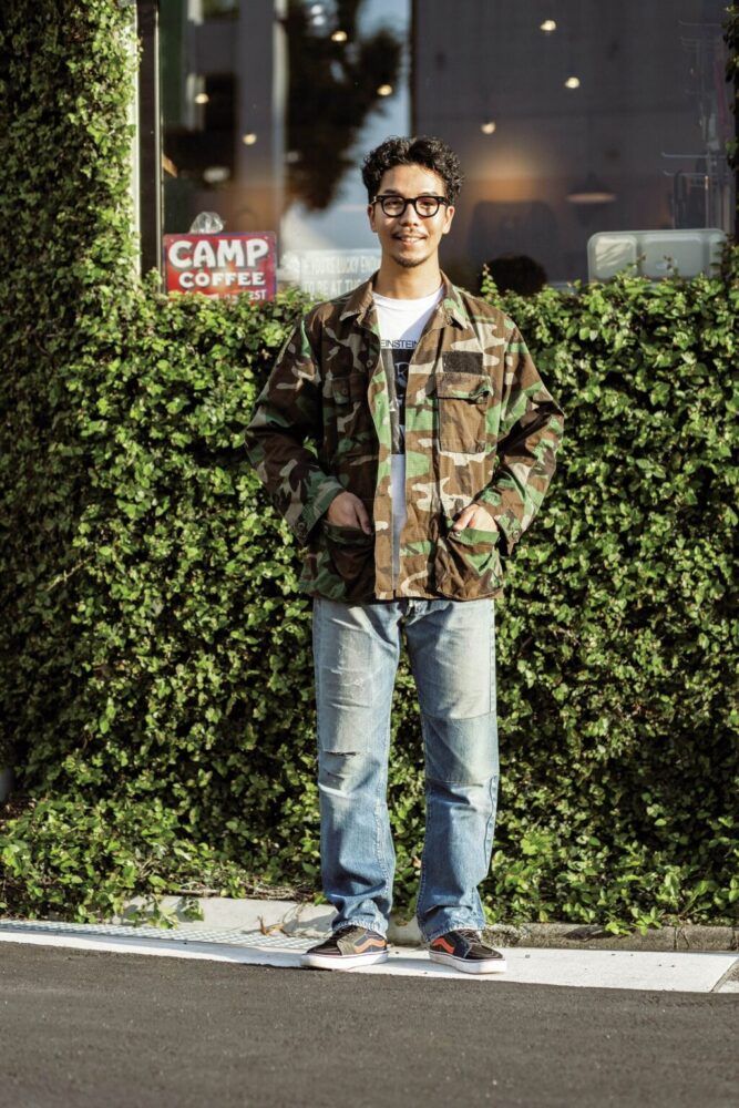 ヴィンテージから日本の硬派なガレージブランドまでセレクトする人気アウトドアショップで働く尾崎さんは、アメリカ軍のコンバットジャケットに、リーバイスの66モデルというアメカジコーデ。インナーのフォトTやヴァンズのスニーカーでうまくこなれた雰囲気にしている。