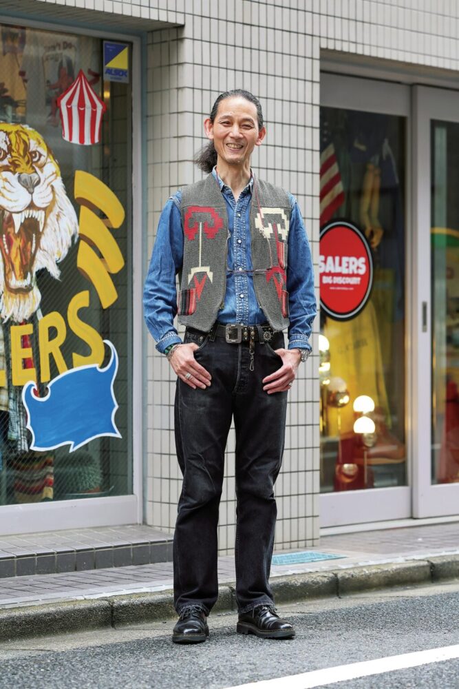 デニムシャツをインナーにオールドナヴァホのベストとブラックジーンズをコーディネイト。「最近、リバイバルで穿くようになった1990年代のアメリカ製のブラックデニム。黒とインディゴのエイジングのコントラストを楽しんでいます」