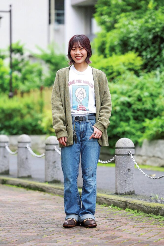 爽やかなカラーコーディネイトにマッチする笑顔が素敵な木原さん。1970年台のロブスコットのカーディガンにジーンズというシンプルな着こなし。「シルエットが好きなブーツカットデニムにカーディガンの定番スタイルですが、ポップなTシャツで季節感を出してみました」