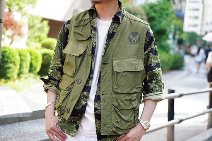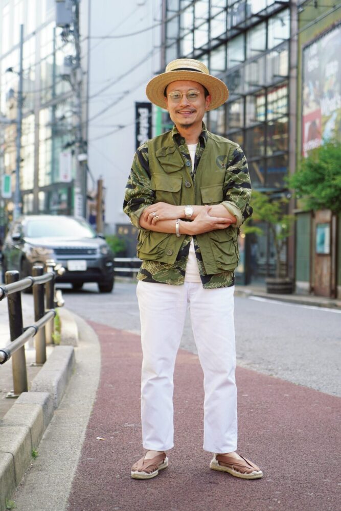 貴重なベトナム戦争時のタイガーストライプカモのジャケットに、USアーミーのラジオをベストをレイヤードしたスタイルが際立つ渡部さん。トップスがハードなので、ボトムスは爽やかにリーバイスのホワイトデニムをチョイス。ザファットハッターのハットも◎