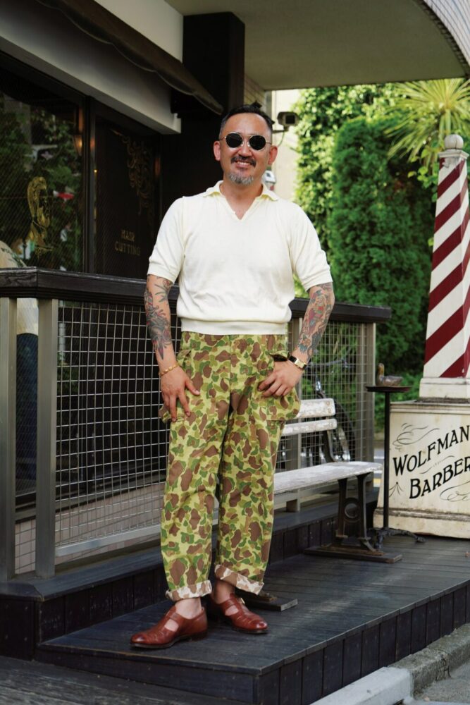 日本のバーバーシーンを牽引する曽原さんは、USMCのフィールドパンツをモチーフとしたブライスランズのミリタリーパンツを基軸にコーディネイト。他のアイテムをシンプルにすることで、大人っぽい着こなしになっている。足元はグルカサンダルで夏っぽく。