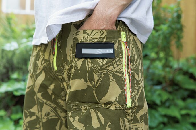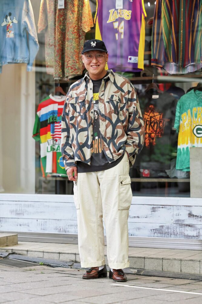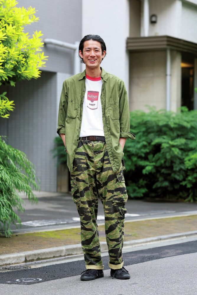 トライバルカモフラージュのシャツが印象的なミリタリーとストリートのミックススタイル。「シャツは’90年代のアサットのもので、ミリタリーテイストの太めのパンツと合わせました。インナーにはバンドTシャツを合わせることでほどよくストリート感を演出しました」