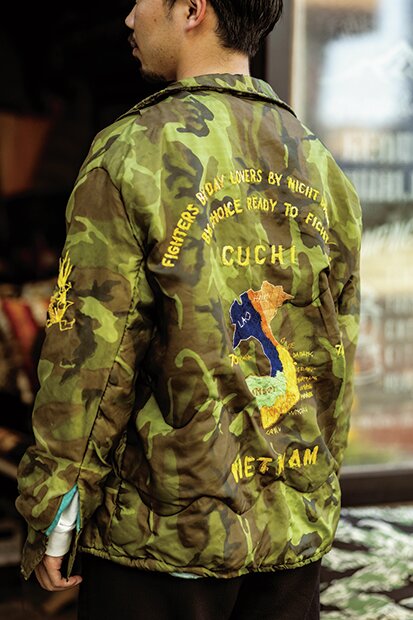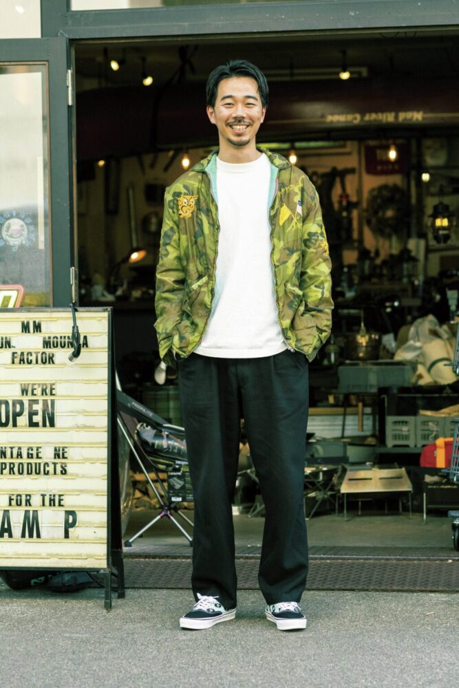 名古屋の人気アウトドアショップでショップマネージャーを務める北島さんは、レアなベトナム戦争時のスーベニアジャケットを基軸にコーディネイト。あえてきれいめなスラックスやオーセンティックなスニーカーを合わせることで、すんなりと着こなしているのが好印象だ。